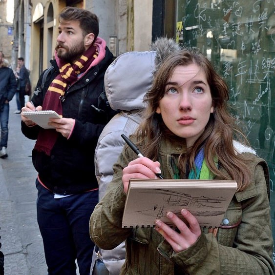 In a project called “Urban Sketching Florence”, Nasser invited students to join him on his quest to travel through the Middle East within an ancient European city. They got an inside look at his process as he created his sketchbook for the “Middle East Now Festival”, compiling his research on Middle Eastern influence within Florence in the form of drawings, collages, and writings. Together they mapped the architecture of Florence while discovering the manifestations of Middle Eastern culture throughout the city.