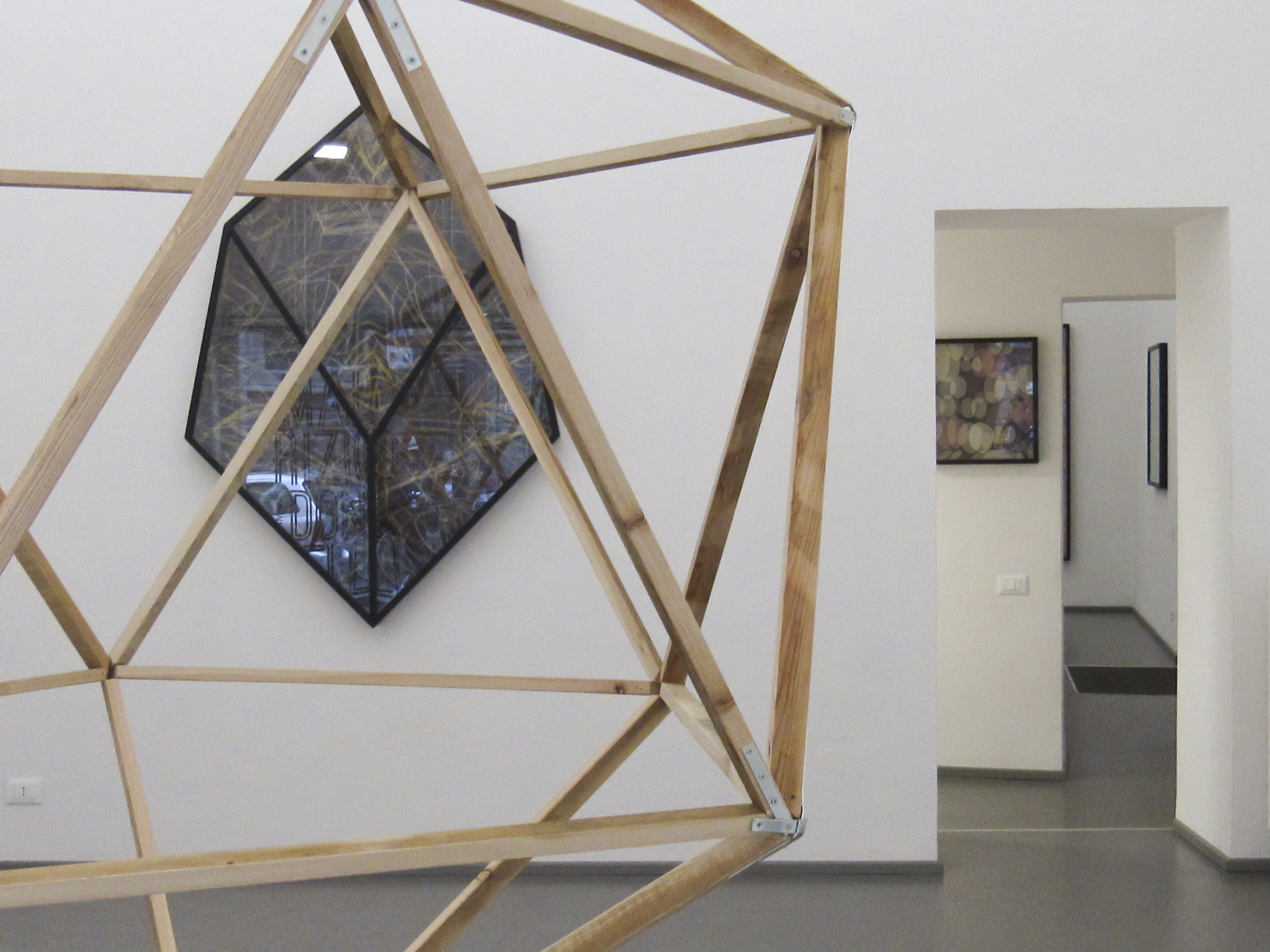 Across the street from the Tornabuoni Arte gallery is the Eduardo Secci Contemporary gallery, which is currently showing works by Italian artist Maurizio Donzelli. In the center of the room, a large wooden geometric shape with 20 sides (also known as an icosahedron) hangs from the ceiling.
