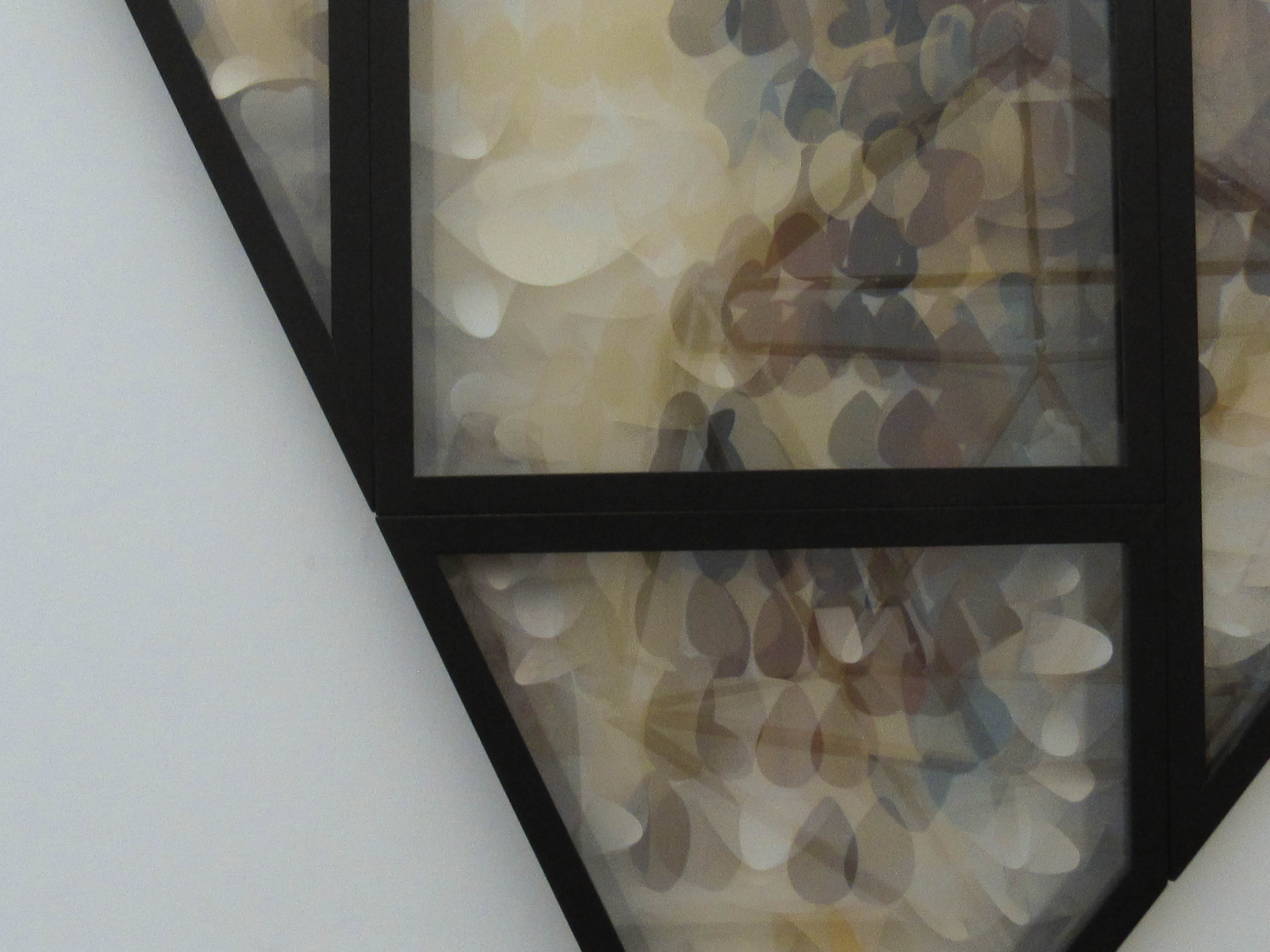 His works explore geometric shapes mainly through experimentation with mirrors. The pieces that hang on the walls change depending on the angle you view them from.