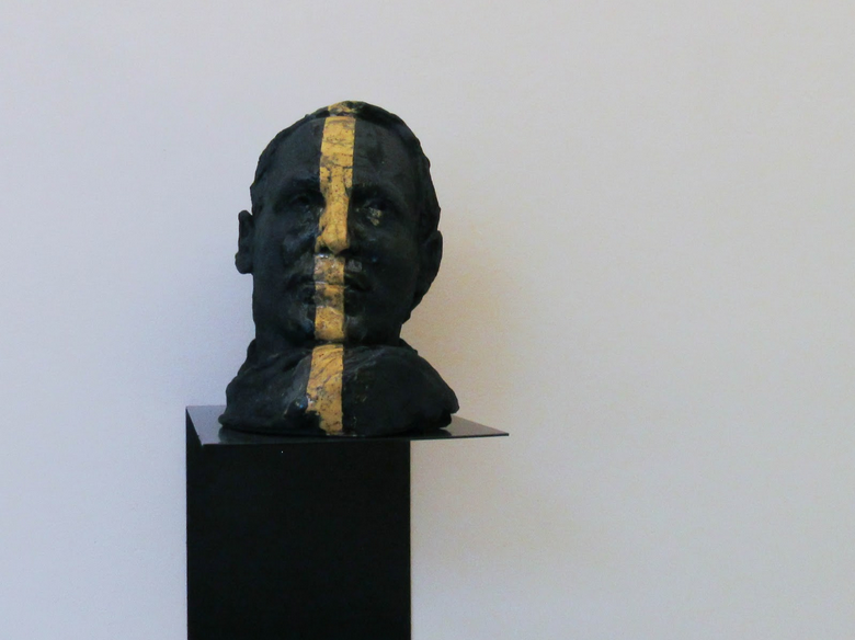 In another room of the exhibit, a clay sculpture by artist Mark Manders resembles historical models yet has contemporary features. A bright yellow rectangular prism appears to be emerging from the right side of the clay sculpture’s face, extending from the top of the nose to the bottom of the mouth. Strands of hair were also added to the left side of the sculpture.
