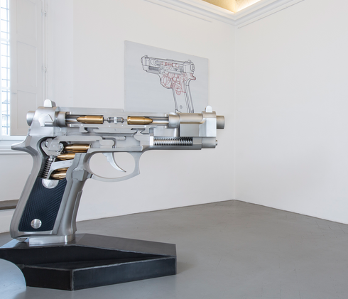 The first exhibition in Italy of Chinese artist Wang Luyan features a series of new paintings realized specifically for the exhibition and a large sculpture of a pistol in stainless steel. Wang Luyan’s work transforms ulitiliarian and common every day objects into irrational and dangerous ones to use, in ways opposed to their normal functions. The exhibition is curated by Lorand Hegyi.